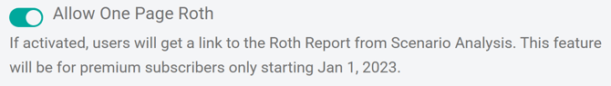 The Roth Explainer is available to those subscribed to a Premium Plan or higher. Users with Firm Admin privileges will first need to enable the tool by navigating to Settings > Security Settings and toggling on the "Allow One Page Roth" permission setting seen below, underneath the Firm Preferences section.