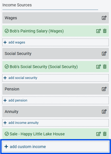 If you want to model additional income cash flows that don't fit nicely into the categories for wages, Social Security, pensions, or annuities, you can add custom income streams as well.