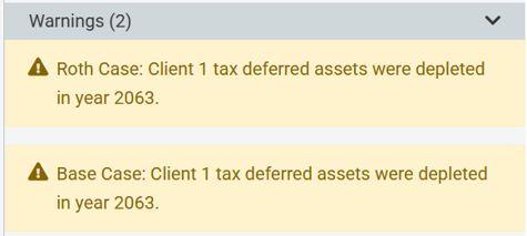 - Warnings - These cautionary warnings indicate when some entries were not modeled fully as intended, due to calculations made within the analysis. Any warnings preventing the Roth Projection analysis from being completed will appear in red at the top of the Roth Projection page.