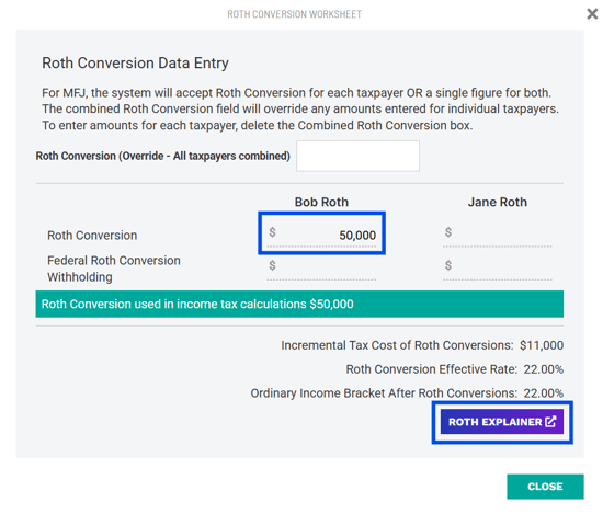 Also, once a Roth Conversion amount is successfully entered, the purple Roth Explainer button will pop up to launch the Roth Explainer tool. In the example below, Bob Roth is going to make a $50,000 Roth conversion.