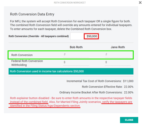 - The Roth Conversion (Override - All taxpayers combined) field is being used instead of the fields specific to Taxpayer 1 and/or Taxpayer 2. In the example below, you would clear the $25,000 entry outlined in red, which will open up the fields outlined in green to enter the amount of the Roth conversion per taxpayer.