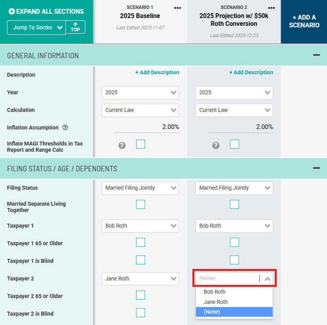 - Taxpayer 1 and/or Taxpayer 2 have not been assigned in the Age/Filing Status/Dependents tab of Scenario Analysis. In the example below, we have not assigned Cradle Will Roth as Taxpayer 2. If you have not added the second taxpayer (Cradle, for example, in this case), you will need to navigate back to the client's household and add them as a client.