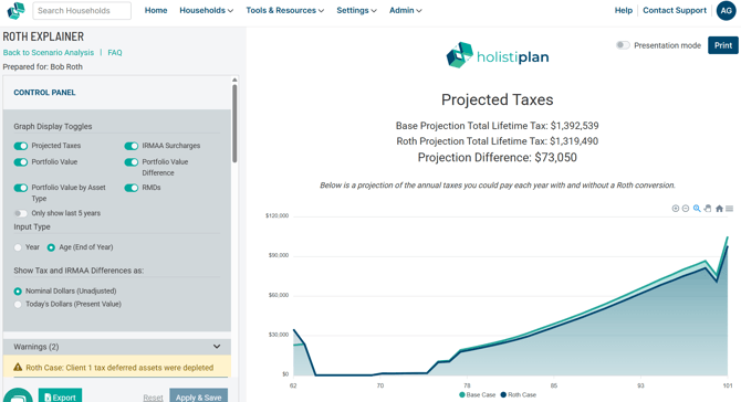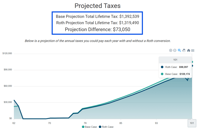 The Projected Taxes graph shows lifetime tax projections of both the base scenario (with none of the Roth conversions entered earlier) and the Roth conversion scenario, which are outlined in blue above. The projection difference indicates the lifetime tax savings anticipated by executing the Roth conversions as entered earlier when you built your projection. In the example above, we see that by utilizing Roth conversions over several years, this client is projected to save $73,050 in taxes.