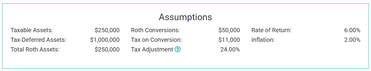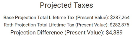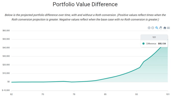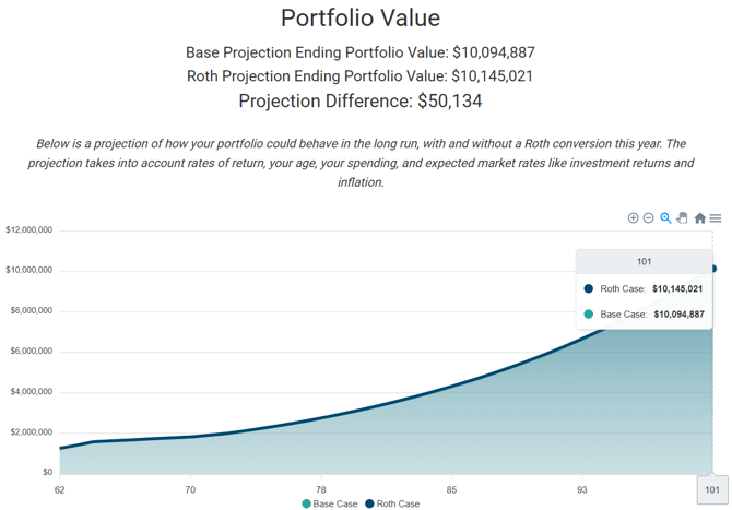 In the example above, the projected total portfolio balance is $10,145,021 if the Roth conversion were to be done, compared to $10,094,887 if not done, indicating total portfolio assets would be estimated to be $50,134 higher.