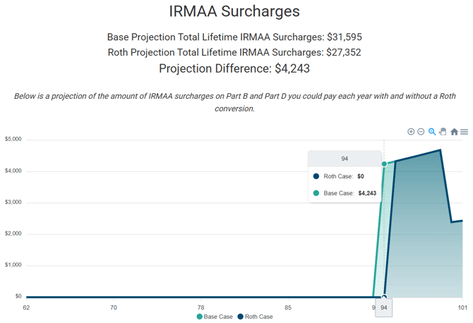 While not technically a tax, IRMAA (Income-Related Monthly Adjustment Amount) surcharges on Medicare Part B and D Premiums can be a consideration for Roth conversion planning as well. Within the Roth Explainer, you can see the impact of this single Roth conversion on IRMAA surcharges. To enable this additional graph, toggle on this option in the Control Panel.