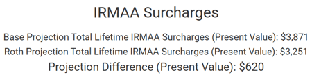 Above, you will see that as a result of the Roth conversions, there is a savings of $4,243 in IRMAA surcharges down the road as a result of reducing the income that is pushed out from future RMDs (Required Minimum Distributions) from those tax-deferred retirement accounts as a result of the Roth conversion. Similar to the Projected Taxes graph, you can also discount the IRMAA Surcharge into a net present value as well by using that same toggle.