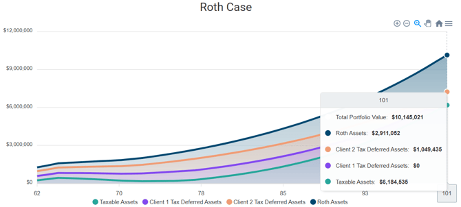You can also view the various account balances across the taxable assets, tax-deferred assets for each client, and the combined Roth assets. The balances on these pots of money are shown under the Base Case scenario and the Roth Scenario. Hovering over the graph area will show the balances over time of each asset type as you move along the x-axis.