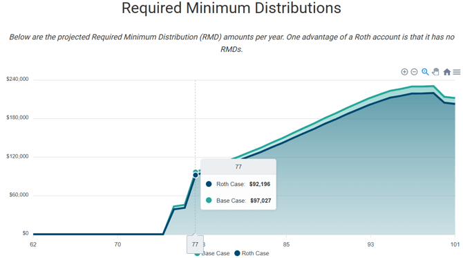 In the example below, this one-time $50,000 Roth conversion will lower the RMDs these clients would otherwise have to take. When both clients begin RMDs at Client 1's age 77 (remember, taxpayers born in 1960 and later have an RMD of age 75, and Client 2 is two years younger than Client 1), the total RMDs between both clients are $4,831 lower per year as a result of converting that $50,000 in year one.