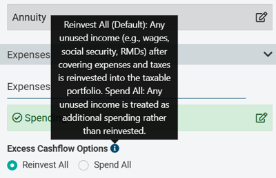 - Excess Cashflow Options - To the extent that income (Wages, Social Security, Pension, or Annuity) is enough to cover expenses (spending, taxes, Medicare premiums), any excess cashflow can either be toggled to "Reinvest All," which add that surplus each year back into taxable assets to be re-invested, or "Spend All," which considers any surplus to be additonal expenses, lost to spending for the remainder of the analysis.
