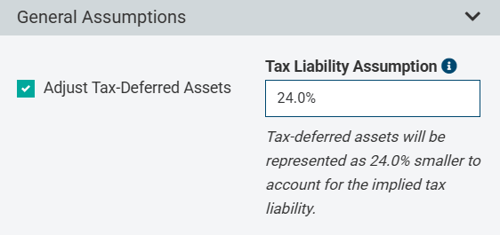 - Tax Liability Assumption / Adjustment for Tax-Deferred Accounts - This setting effectively reduces the tax-deferred balances by the amount of the percentage indicated to reflect the embedded tax liability for those accounts. We default to 24% arbitrarily.