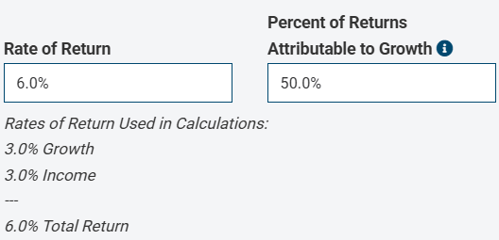 - Percent of Returns Attributable to Growth - This assumption allows you to indicate how much of the rate of return is due to growth and how much is due to income. The default value for this field is 50%, but that value is purely arbitrary.