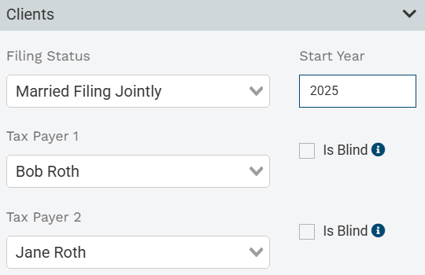 - Clients - Adjust the information for your clients that you entered when creating the Roth Projection, including filing status, assigning Taxpayer/Client 1 and Taxpayer/Client 2, the year the analysis will begin, and indicate if either taxpayer is eligible for the additional standard deduction for blindness.
