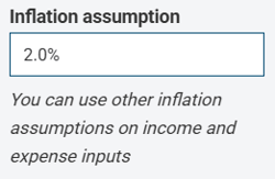 In the example above, half of the 6% return, or 3% per year, will be taxed as "income" from the portfolio, while half of the 6% return (or 3%) will remain in the taxable assets balance, to be grown for eventual distribution in the future, at long-term capital gains rates. - Inflation Assumption - Enter the assumed inflation assumption for tax brackets, standard deduction, and IRMAA brackets. Inflation assumptions for spending and income items are added for each of those items individually, and not in this field.