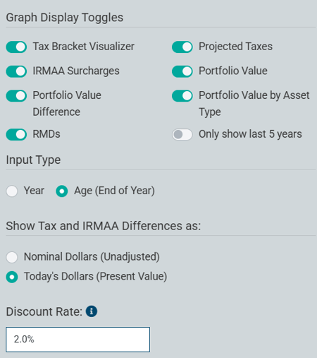 - Graph Toggles/Options - Toggles exist to show or hide the Tax Bracket Visualizer, Projected Taxes, IRMAA Surcharges, Portfolio Value, Portfolio Value Difference, Portfolio Value by Asset Type, and RMDs section, as well as only to show the last 5 years of portfolio balance estimates. You can also choose to input data by the calendar year or client age, and to show tax and IRMAA differences in nominal dollars (unadjusted) or today's dollars (net present value using a discount rate), depending on what makes the most sense for you.