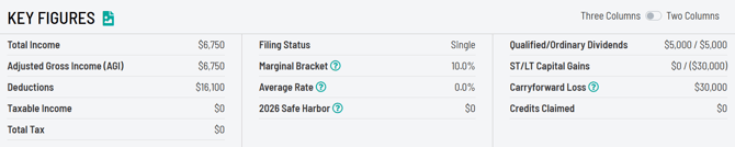 But had the taxpayer not taken the loss, total income and AGI would have been $9,750. With the same standard deduction, taxable income would still be negative, and the tax bill would still be $0. The loss didn't help the taxpayer.