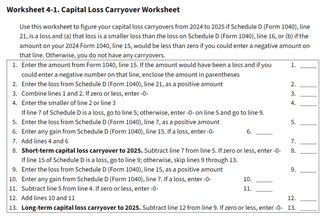 Worksheet 4-1 of Publication 550 contains the steps to determine the loss carryforward, and is the worksheet Holistiplan uses in its internal audit to arrive at the amount of loss carryforward: